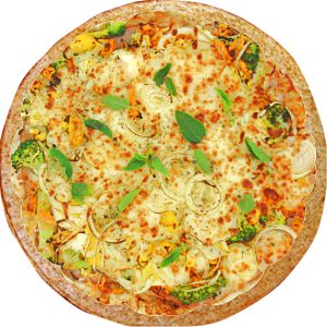 Brócolis, Cebola, Champignon, Frango desfiado, Manjericão, Massa integral, Molho DNA, Muçarela de búfala, Orégano, Ovo, Peito de peru