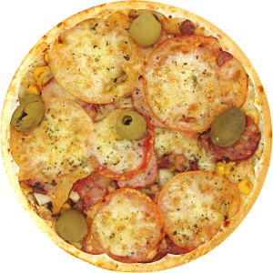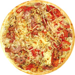 Azeitonas, Bacon, Calabresa, Milho, Molho de tomate, Muçarela, Orégano, Palmito, Tomate
