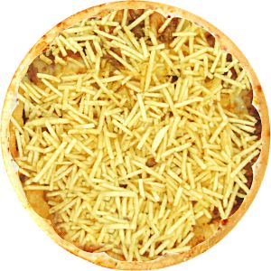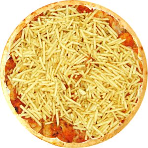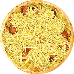 Batata palha, Ervilha, Milho, Molho de tomate, Muçarela, Orégano, Salsicha