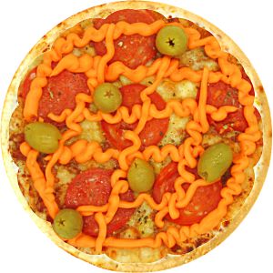 Azeitonas, Bolonhesa, Cheddar, Molho de tomate, Muçarela, Orégano, Pepperoni, Pimenta calabresa