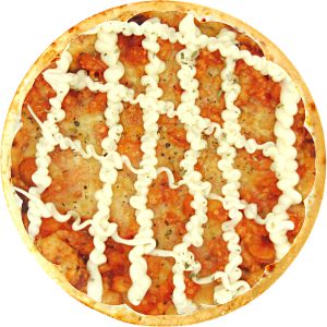 Bacon, Cream cheese, Frango desfiado, Milho, Molho de tomate, Muçarela, Orégano
